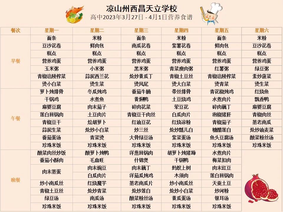 凉山州西昌天立学校营养食谱每周制定一次,采用粗细粮搭配、荤素搭配、咸甜搭配等,保证学生饮食健康、每日营养摄取量合理,充分满足学生日常生活所需,促进身体健康成长。