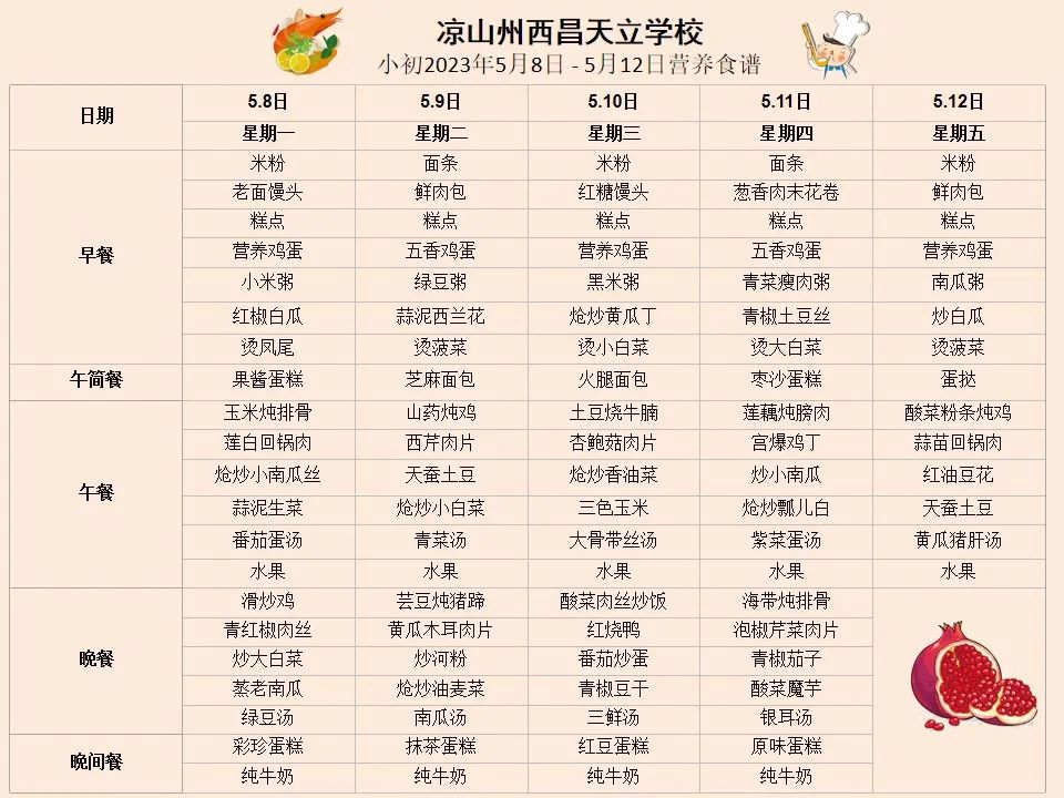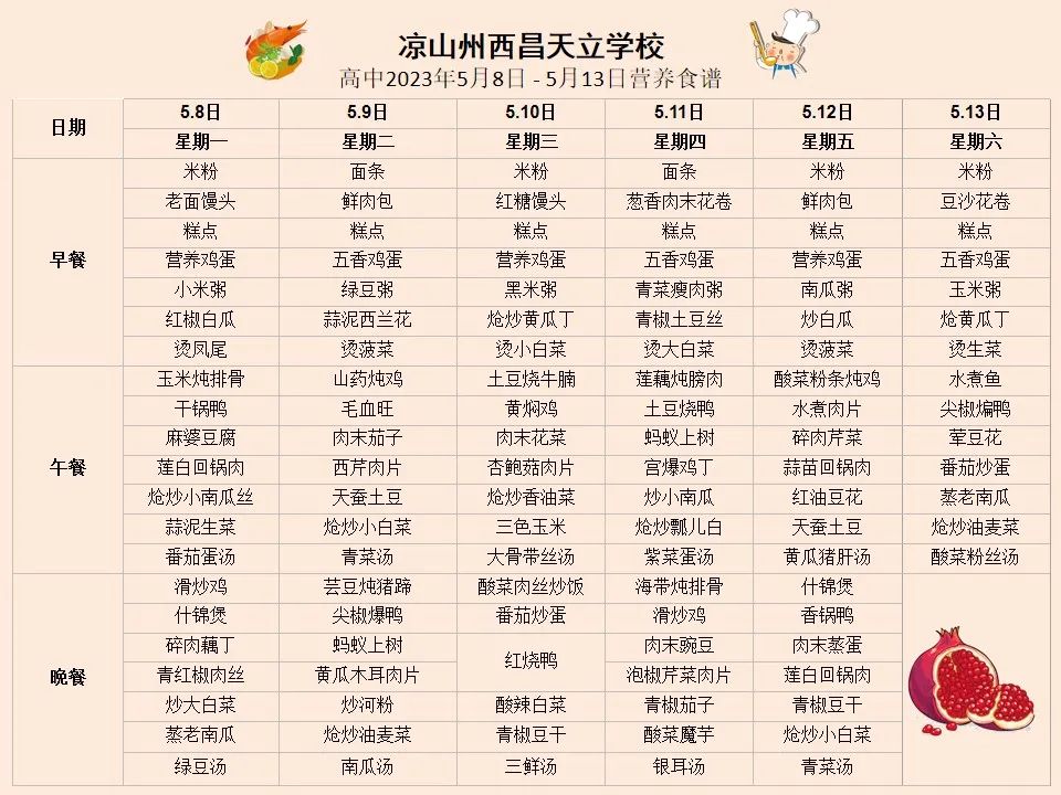 凉山州西昌天立学校营养食谱每周制定一次,采用粗细粮搭配、荤素搭配、咸甜搭配等,保证学生饮食健康、每日营养摄取量合理,充分满足学生日常生活所需,促进身体健康成长。